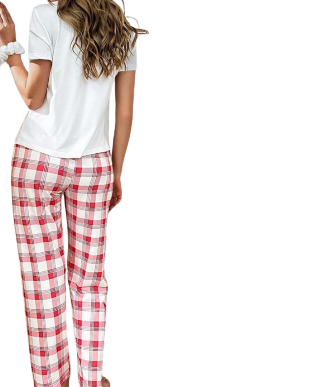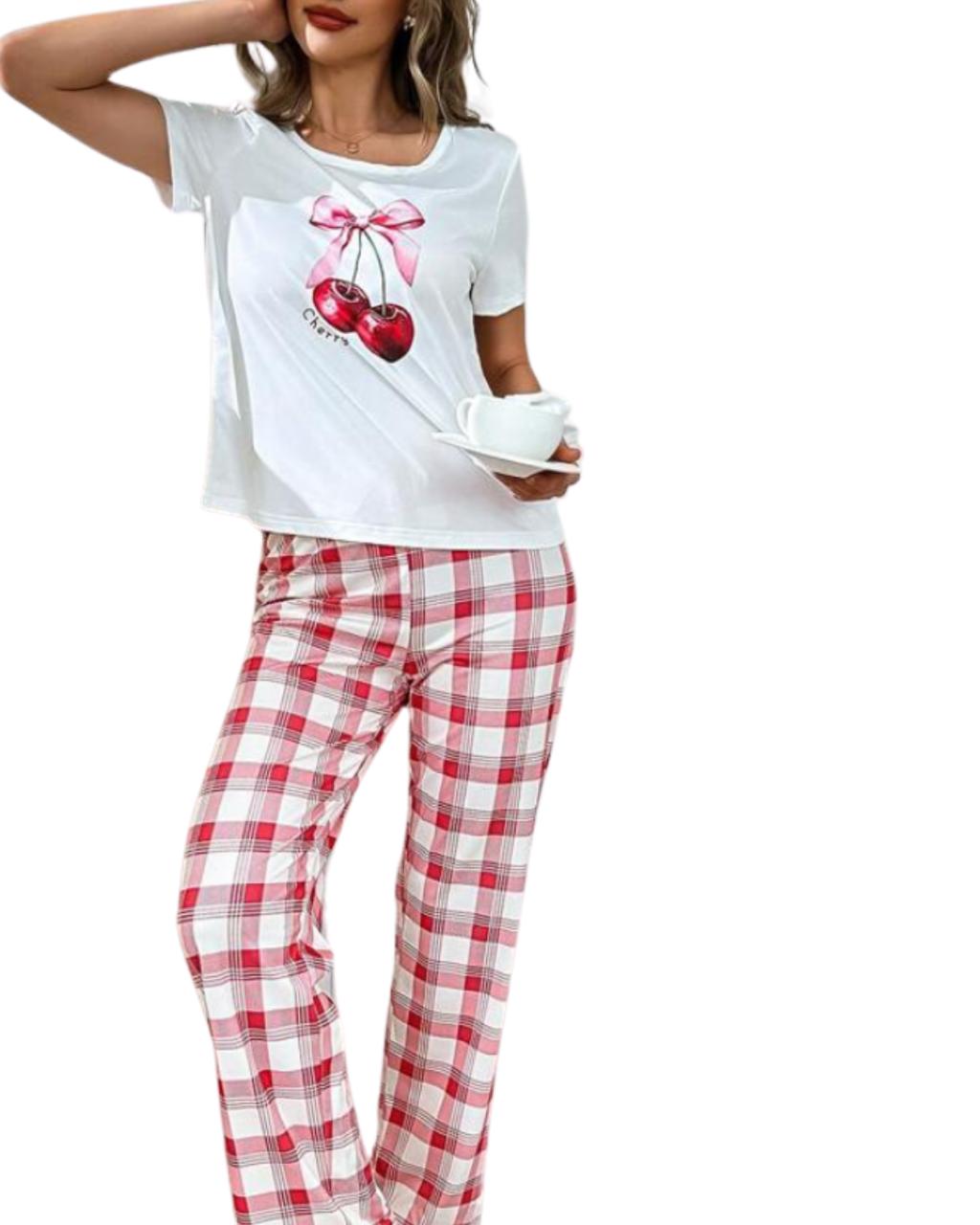Cherry Print Short Sleeve Top And Plaid Pants Pajama Set.