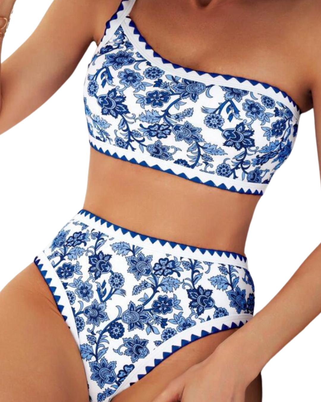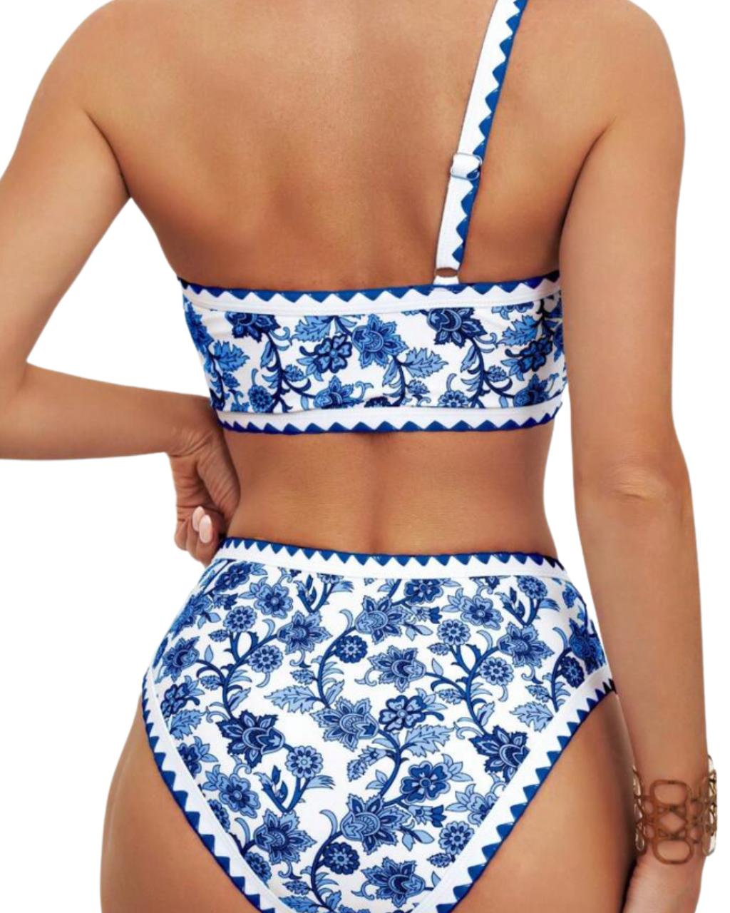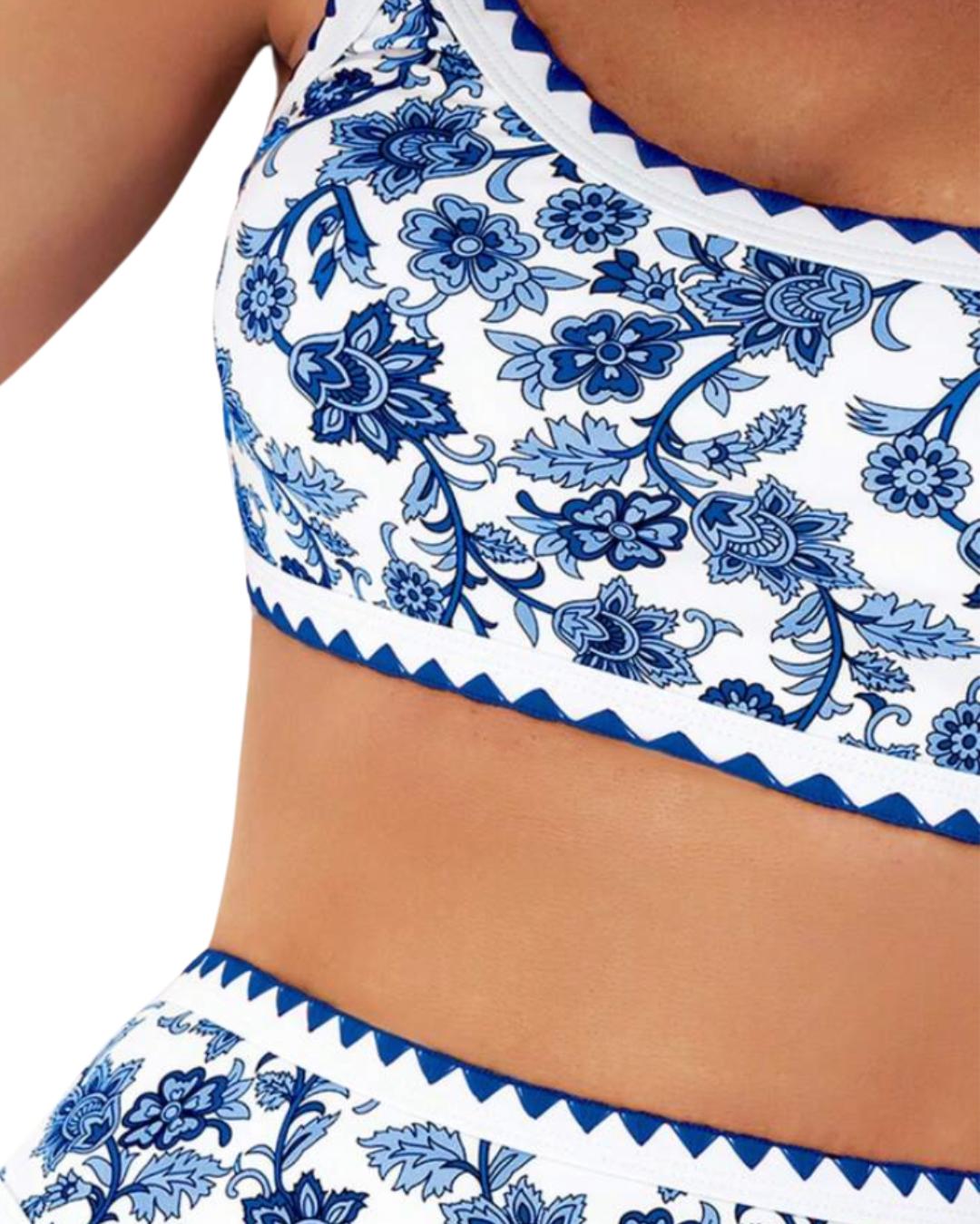 Two Pieces Colorblock Floral Print With Contrast Trim Bikini Set.
