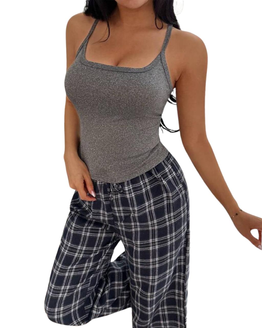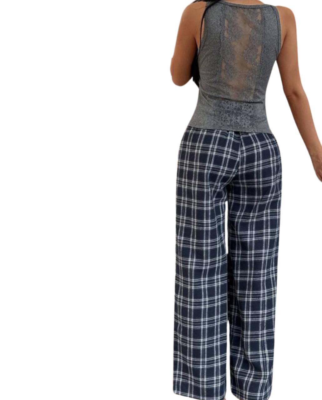 Women's Set Casual Backless Contrast Lace Bodycon Camisole And Plaid Pants Pajamas.