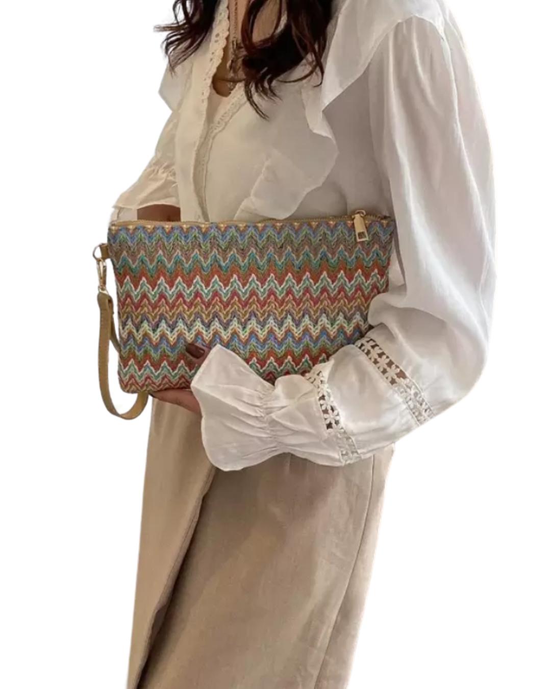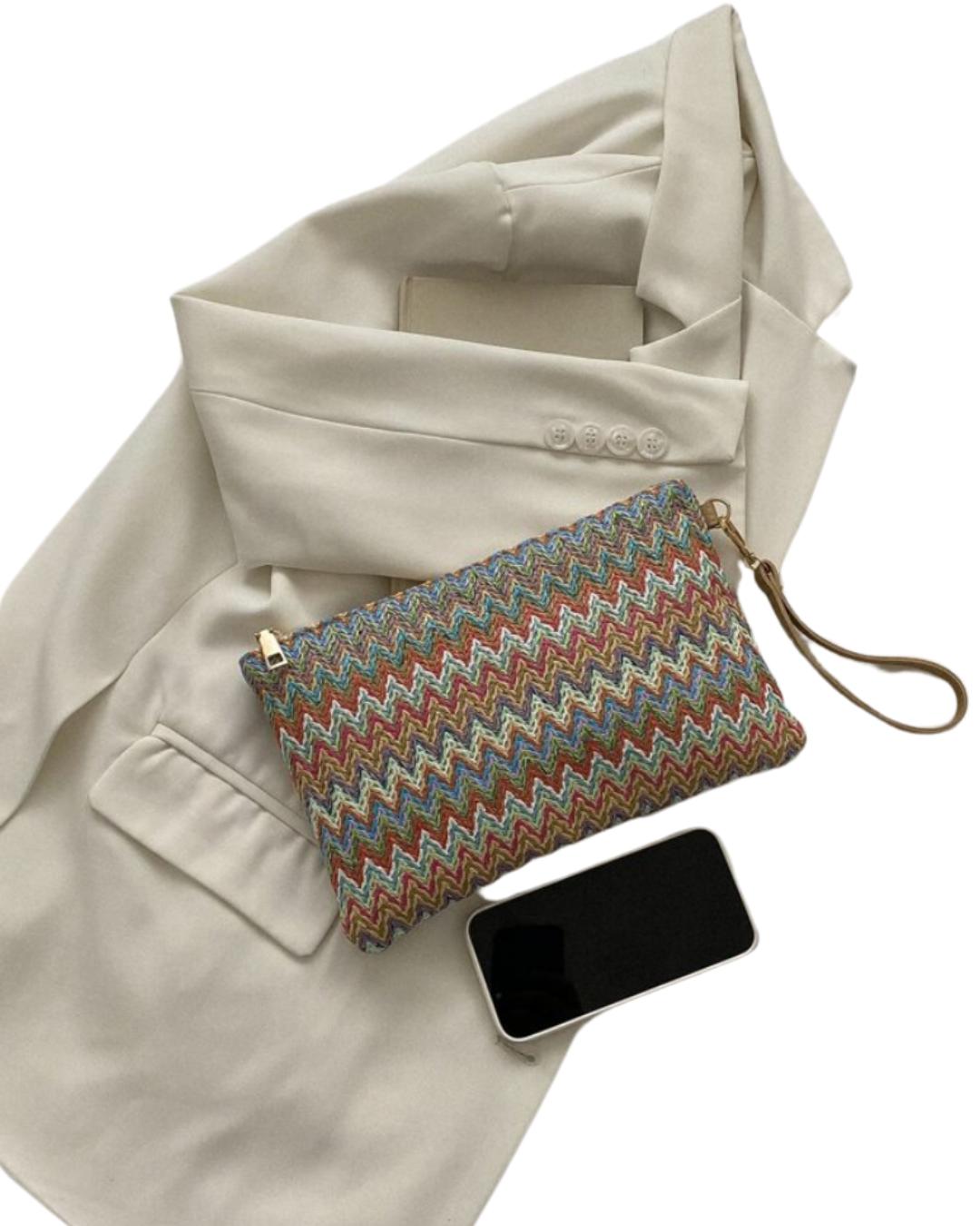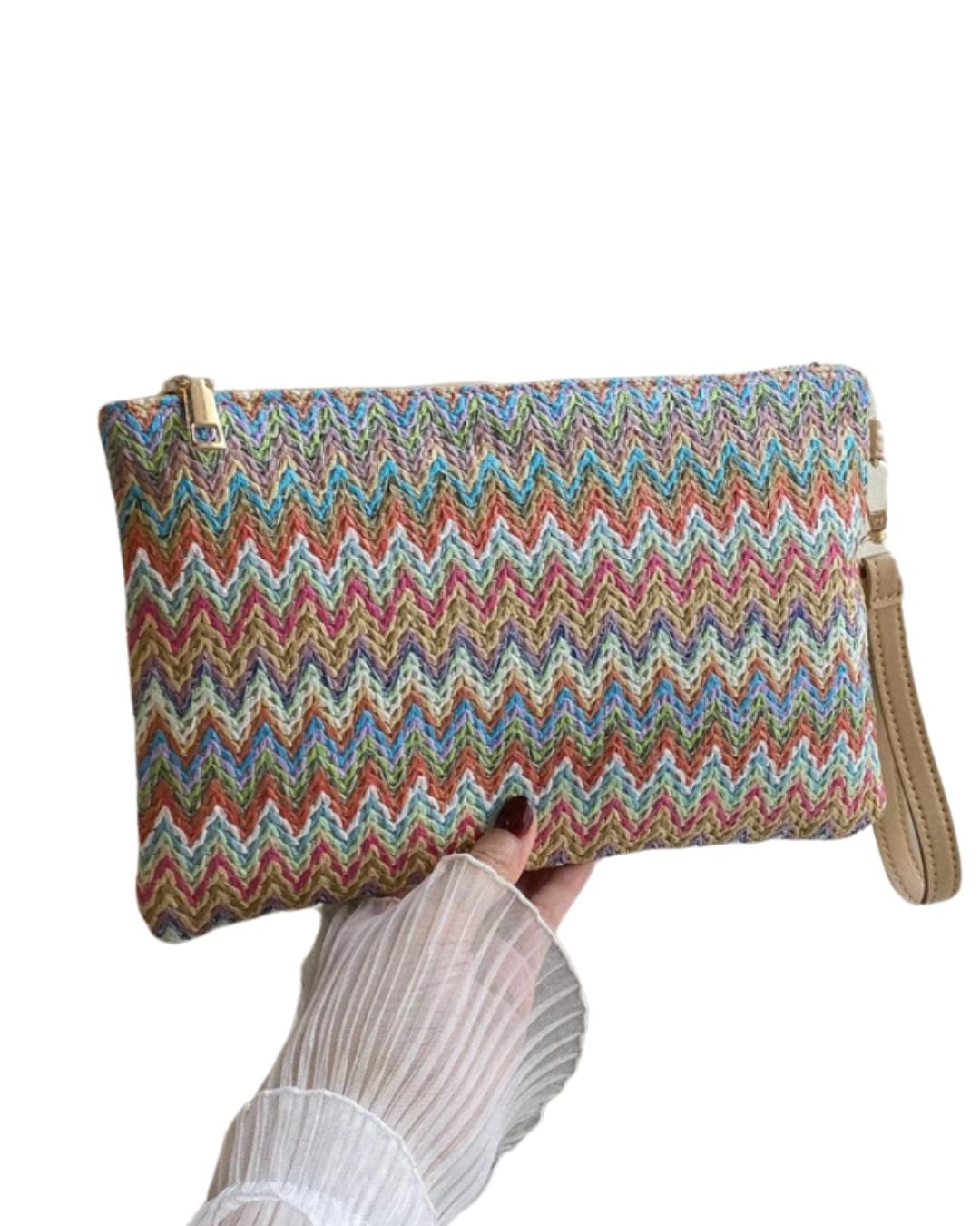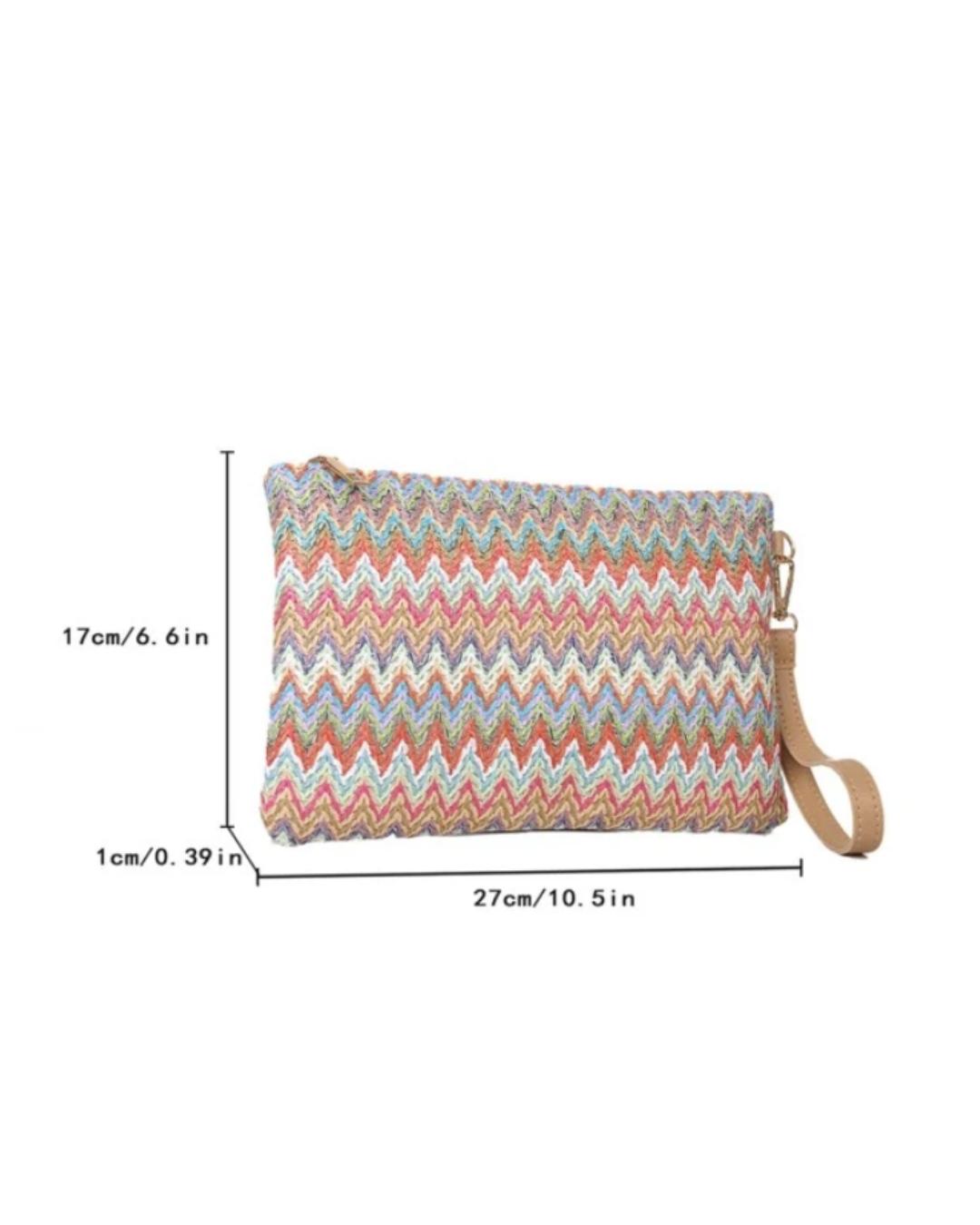 Woven Chevron Pattern Straw Bag With Wristlet.