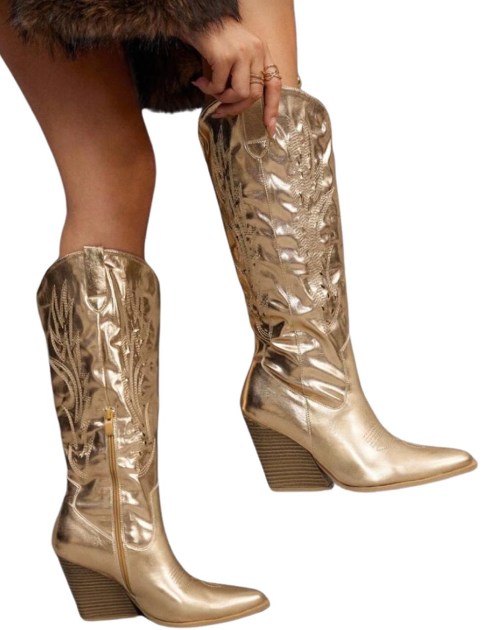 Glossy Side Zipper Design High Heel Western Style Fashion Boots.